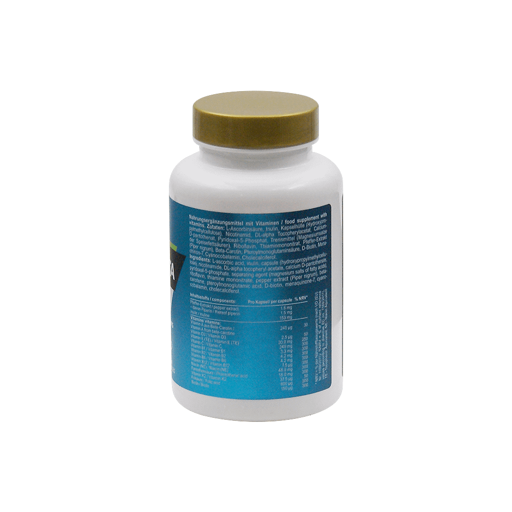 Multivita tukee tasapainoista ruokavaliota. Tuote sisรคltรครค vitamiinit A, C, D, E, K sekรค koko B-kompleksin (B1, B2, B3, B5, B6, B7, B9 & B12). Vain yksi kapseli pรคivรคssรค riittรครค kattamaan vรคhimmรคisvitamiinitarpeen.